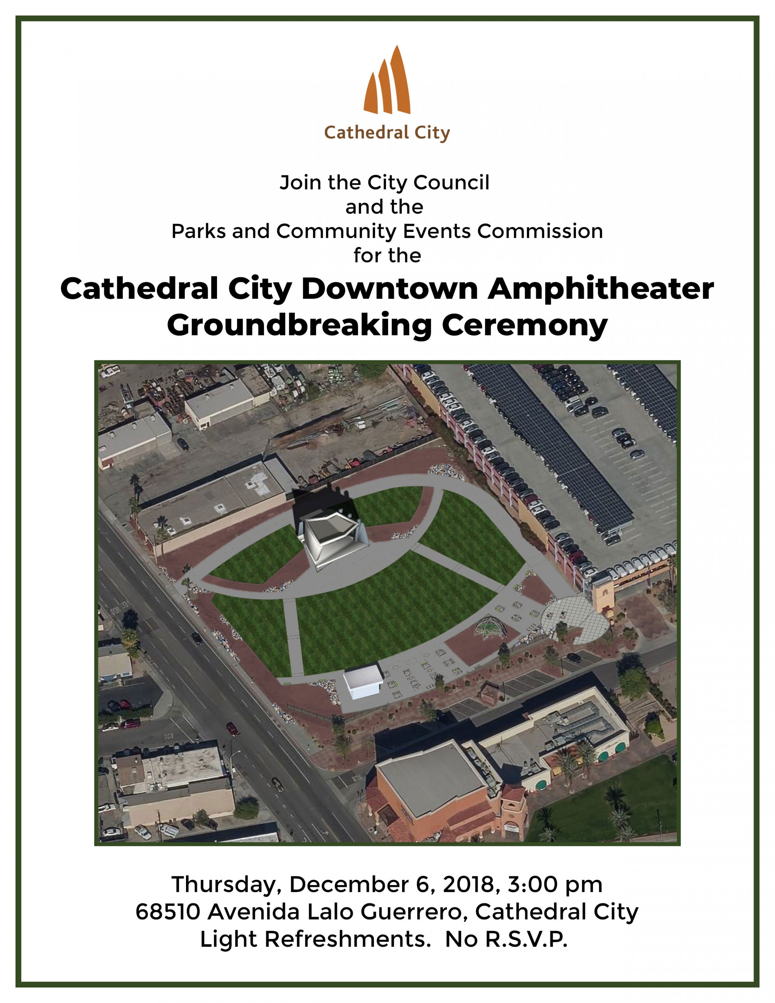 Join the City Council and the Parks and Community Events Commission for the Cathedral City Downtown Amphitheater Groundbreaking Ceremony on Thursday, December 6, 2018, 3:00 pm located at 68510 Avenida Lalo Guerrero, Cathedral City.