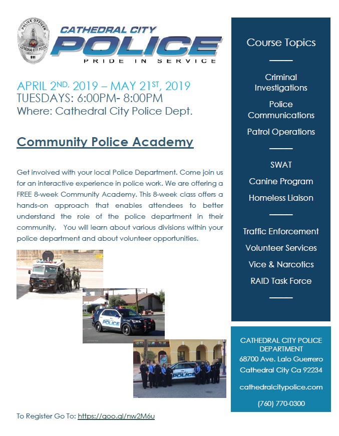 Classes occur once a week every Tuesday from 6 pm to 8 pm starting on Tuesday, April 2, 2019 through Tuesday, May 21, 2019 at the Cathedral City Police Department, 68-700 Avenida Lalo Guerrero.