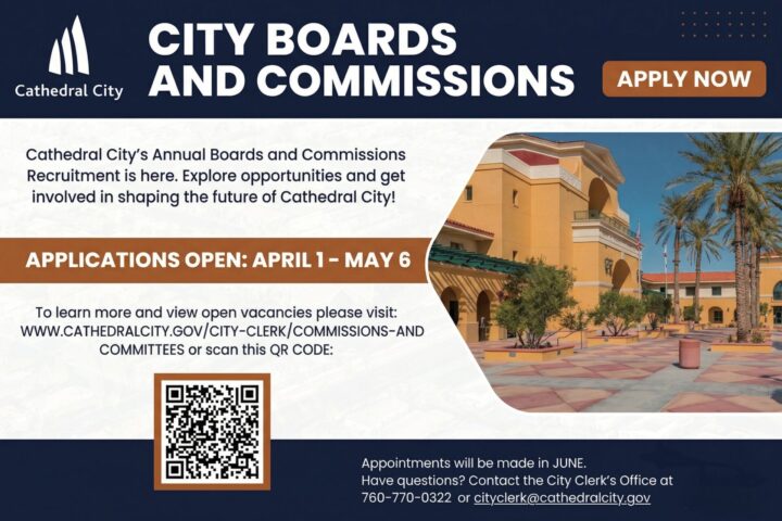 The City of Cathedral City is inviting residents to get involved in local government by applying for open seats on several City Boards and Commissions. The annual recruitment period runs April 1 through May 6,...Continue reading→