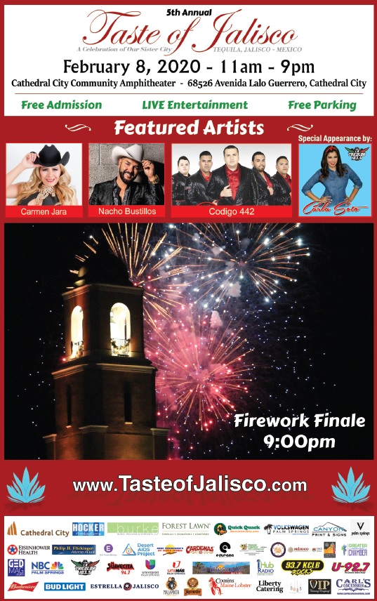 Join us at the new Cathedral City Community Amphitheater located in Downtown Cathedral City for the 5th Annual Taste of Jalisco Festival that celebrates the sister city relationship between the cities of Cathedral City, California (USA) and Tequila, Jalisco (Mexico) through music, fashion, spirits, culture and cuisine this Saturday, February 8, 2020 from 11 am to 9 pm. The weather is predicted to be sunny and 80 degrees! Free admission. Free Parking.