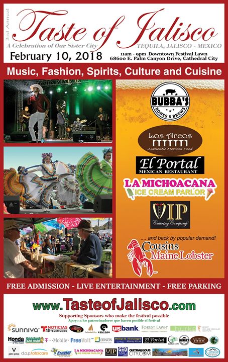 Come for the delicious Mexican-inspired food, enjoy a great line-up of LIVE Entertainment, sample some Tequila, meander through the Outdoor Market, bring the young ones to the free Kid Zone and stay for the Firework Finale at 9:00 pm at the 3rd Annual Taste of Jalisco Festival, presented by Sunniva, Inc., on Saturday, February 10th from 11 am to 9 pm in Downtown Cathedral City, 68-600 East Palm Canyon Drive. Free admission. Free parking.