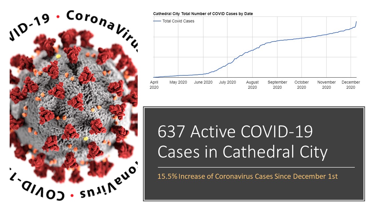 Now is definitely not the time to let your guard down when it comes to protecting your family from contracting the Coronavirus. Yesterday, Cathedral City had its highest record number of a one day total since the COVID-19 pandemic began. Cathedral City had an increase of 222 confirmed cases. There is speculation, though, that a backlog of other day totals was included in yesterday’s numbers. Even if that is true, Cathedral City has had a 15.5% increase in total number of COVID-19 cases since December 1st. As of the first of the month, Cathedral City had a cumulative combined total of 2,405 confirmed cases since the pandemic began. As of yesterday, that number soared to 2,772 with 2,135 recovered patients, leaving 637 active COVID-19 cases in our city according to data from Riverside University Health Systems. And unfortunately, two Cathedral City residents lost their battle with COVID-19 since December 1st.