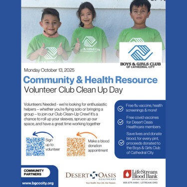 Please join the Boys & Girls Club of Cathedral City on Monday, October 13th, for their "Community & Health Resource Fair" and "Volunteer Club Clean Up Day." Hope to see you there ...Read more