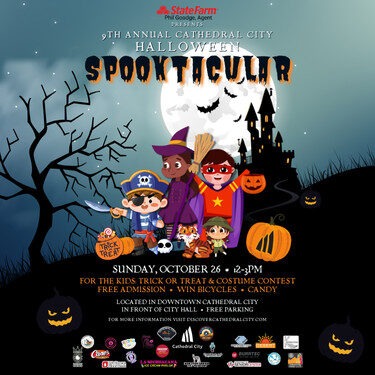 Join us for the 9th Annual Cathedral City Halloween SPOOKTACULAR on Sunday, October 26th from 12-3pm located in downtown Cathedral City in front of City Hall. FREE ADMISSION, Kids Treat or Treat and Costume Contest, Win Bicycles, visit vendors for CANDY, and ...Read more