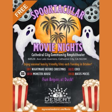 And don't forget—the Halloween spirit continues with Spooktacular Movie Night on Tuesday, October 28 at dusk, when the Desert Recreation District presents Hocus Pocus at the Cathedral City Community Amphitheater (68526 Ave Lalo Guerrero). These free, family-friendly screenings are perfect for a cozy evening out. Visit myrecreationdistrict.com/Movies for more information.