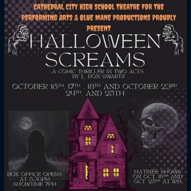 Cathedral City High School Theater for the Performing Arts & Blue Mane Productions present HALLOWEEN SCREAMS - a comic thriller in two acts. Tickets are available online or at the door. VIP $10 and GA $8 ...Read more