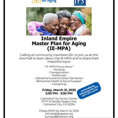 March 21, 2025 Join us March 21st, 2:30 pm for a town hall to learn more about the Inland Empire Master Plan for Aging at The Cathedral City Senior Center. Upcoming Event: Inland Empire Master Plan for Aging (IE-MPA) Townhall 📍 Location: Cathedral City Senior Center37171 W Buddy Rogers Ave, Cathedral City, CA 92234 🗓 Date & Time: Friday, March 21, 20252:30 PM - 3:30 PM(Immediately following …Read more