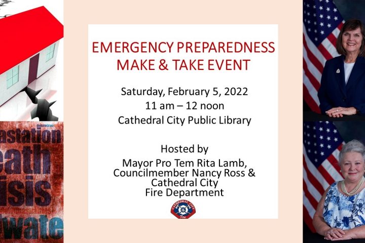 Join Mayor Pro Tem Rita Lamb and Councilmember Nancy Ross along with the Cathedral City Fire Department for a Free Emergency Preparedness – Make and Take Event scheduled for Saturday, February 5, 2022 from 11:00...