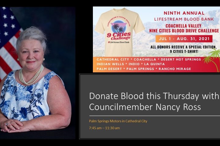 The 2021 Nine Cities Blood Drive Challenge is almost completed and we need your help. Tomorrow, Councilmember Nancy Ross will be at Palm Springs Motors in Cathedral City at 9 am to donate blood as...