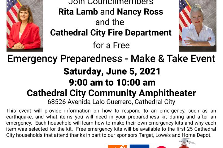 Join Councilmembers Rita Lamb and Nancy Ross along with the Cathedral City Fire Department for a Free Emergency Preparedness – Make and Take Event scheduled for Saturday, June 5, 2021 from 9:00 am to 10:00...