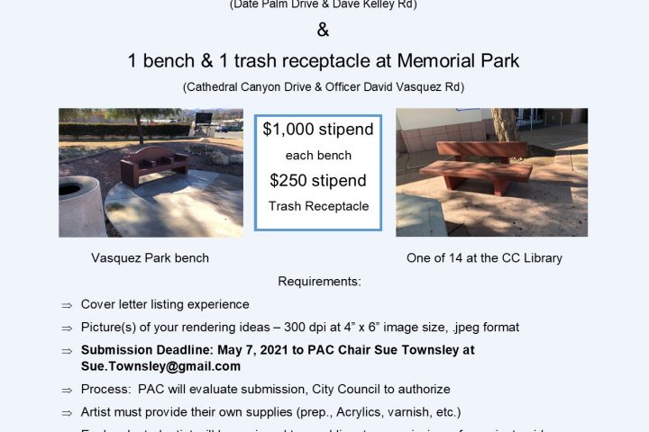 The Cathedral City Public Arts Commission (PAC) is seeking painters / muralists to submit their art ideas / renderings for up to fourteen public outdoor benches at the Cathedral City Public Library and one bench...
