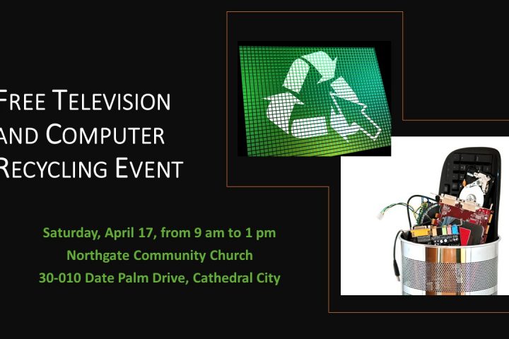 Northgate Community Church is hosting a free Television and Computer Recycling Event on Saturday, April 17, 2021 from 9 am to 1 pm, located at 30-010 Date Palm Drive in Cathedral City. You can recycle...
