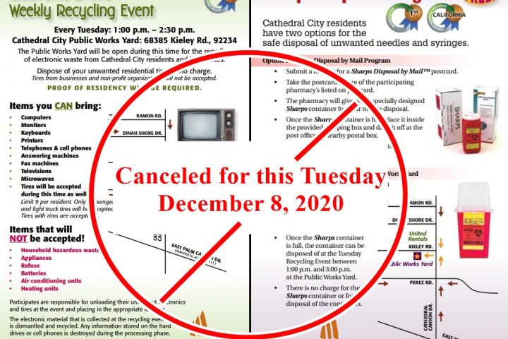 The City of Cathedral City has canceled the weekly Electronic Waste, Tire Recycling, and Safe Syringe Disposal Service scheduled for this Tuesday, December 8, 2020 from 1 pm to 2:30 pm. We apologize for any...