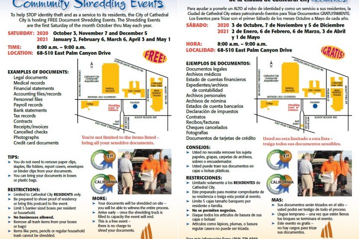 To help STOP identity theft and as a service to its residents, the City of Cathedral City is hosting a FREE Document Shredding Event on Saturday, November 7, 2020 starting at 8:00 a.m. and will...