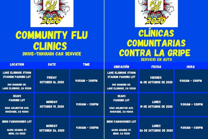 Riverside County Department of Public Health will offer no-cost flu shots for any residents over the age of 3 years on Monday, October 26, 2020 from 9 am to 1 pm at the Indio Fairgrounds...