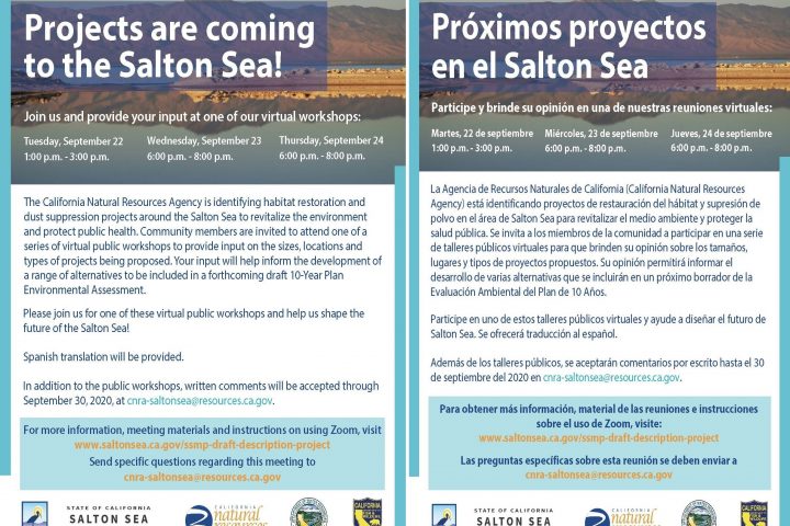 Virtual Workshops to be Held on Newly Released Draft Project Description to Revitalize Environment and Protect Public Health The California Natural Resources Agency (CNRA) has released a draft Project Description for the Salton Sea...Continue reading