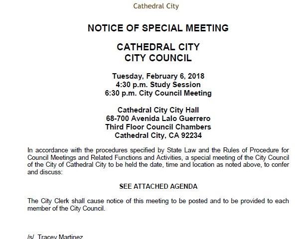 Special City Council Meeting – Tuesday, February 6th The City Council of Cathedral City has vacated its regularly scheduled Council Meeting for Wednesday, February 14, 2018. Instead it will hold a Special Meeting on Tuesday,...