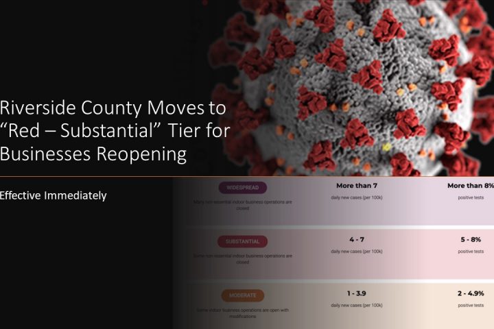 The state announced today that Riverside County will move from the most restrictive COVID-19 tier “Purple – Widespread” to the less restrictive “Red – Substantial” tier, effective immediately. Thanks to residents doing their part (wearing...