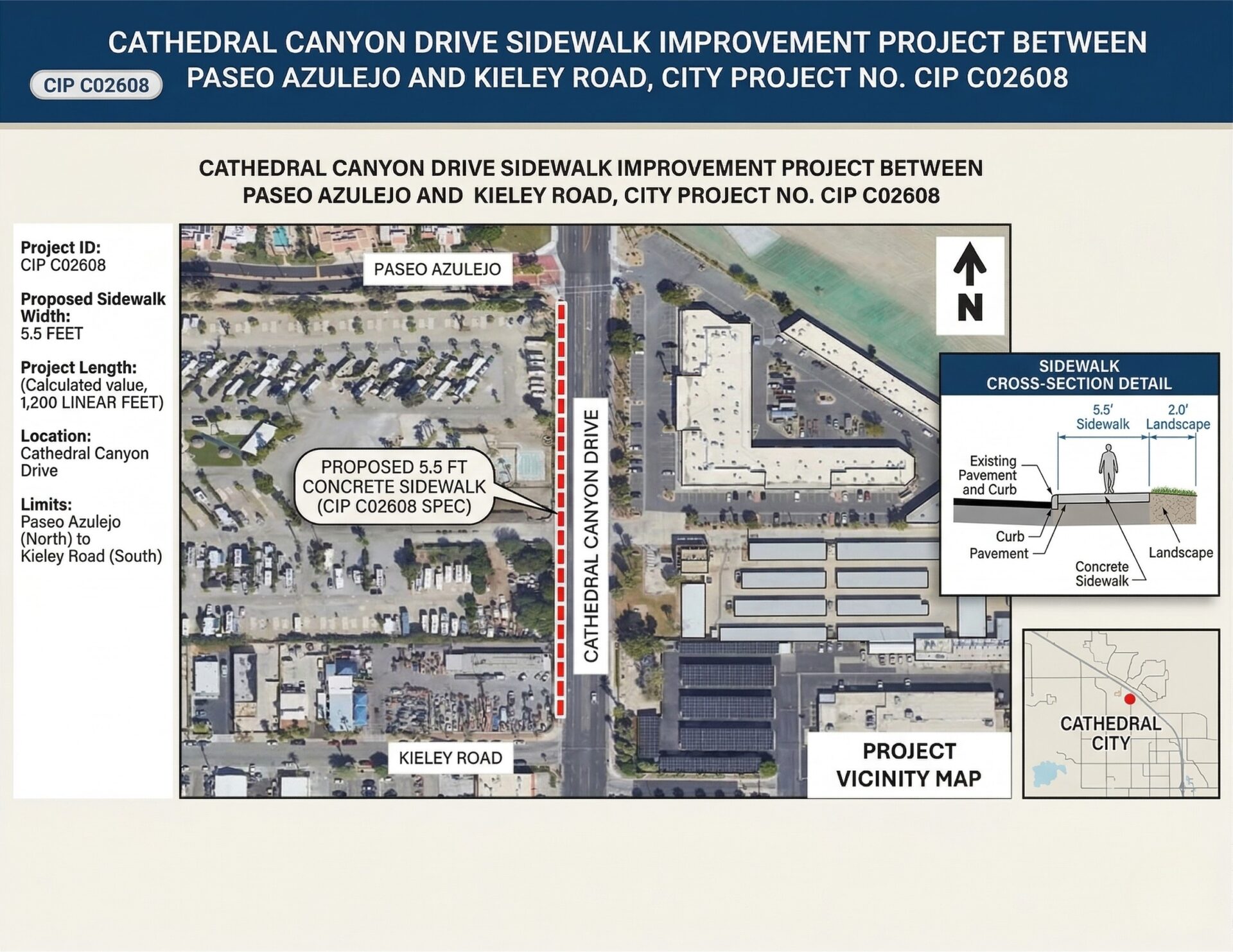 Project vicinity map showing the proposed 5.5-foot concrete sidewalk along the west side of Cathedral Canyon Drive between Paseo Azulejo and Kieley Road.