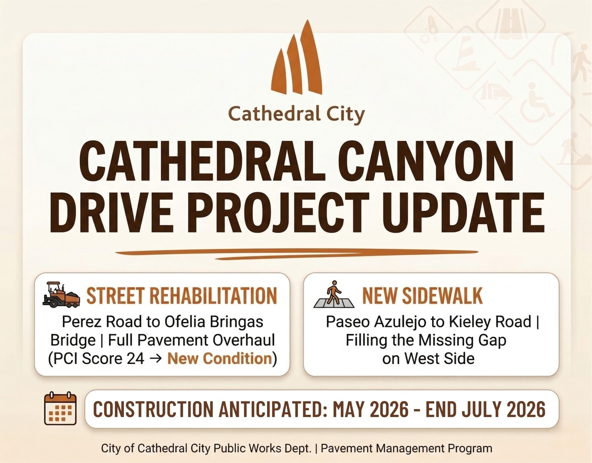 On April 22, 2026, the City Council awarded a construction contract for the Cathedral Canyon Drive Street Rehabilitation Project. Once completed, residents and commuters can expect a significantly improved driving surface upon completion.