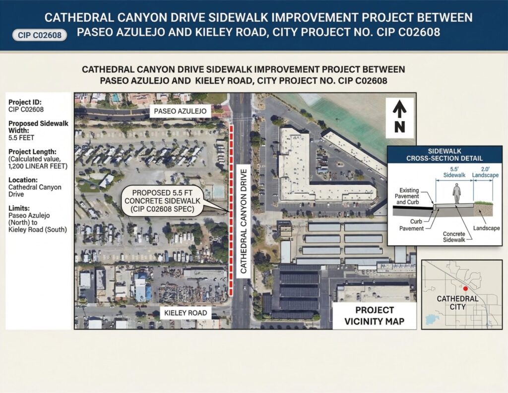 This sidewalk completes the final segment of a planned pedestrian corridor along Cathedral Canyon Drive that has been a priority in the city’s Active Transportation Plan since 2023. Prior projects — including the Ofelia Bringas Memorial Bridge (2022) and the ATP Cycle 5 Sidewalk and Multiuse Trail Project (2025) — have already delivered sidewalk improvements between Dinah Shore Drive and Paseo Azulejo. An existing sidewalk already runs along the east side of the road within this project segment.