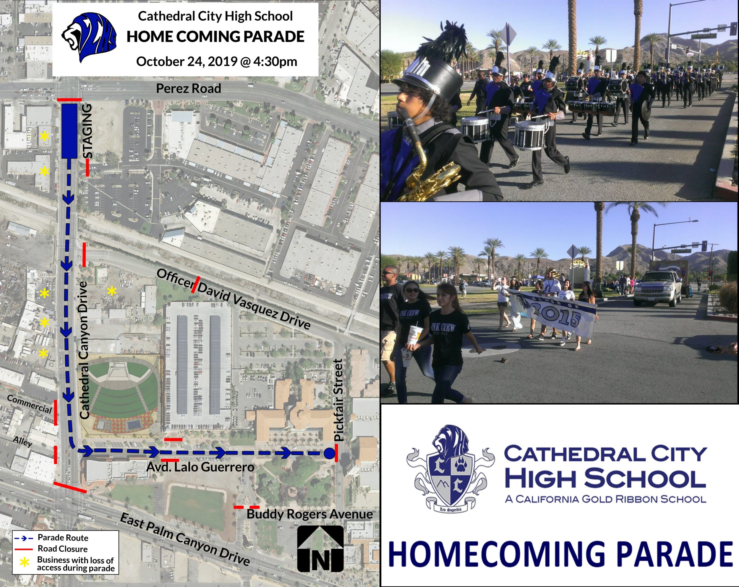 With increased security measures, both northbound and southbound traffic of Cathedral Canyon Drive between Perez Road and East Palm Canyon Drive (Highway 111) in Cathedral City will be temporarily closed and re-routed on Thursday, October 24, 2019 between 3:00 pm and approximately 5:00 pm. Motorists should use an alternate route such as Date Palm Drive and expect traffic delays due to the detour of traffic from this major north – south artery. Access to area businesses will be limited to secondary streets. Public parking for the Homecoming Parade is available at the City Downtown Parking Garage with access to enter and exit from Officer David Vasquez Road (see map for more details).