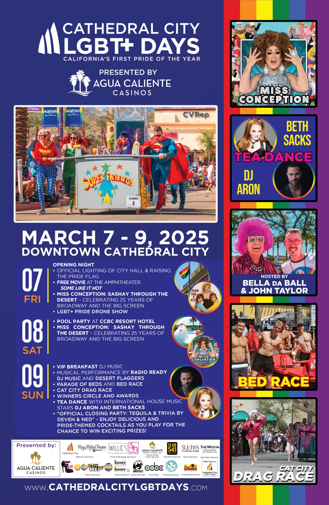 As California’s first Pride event of the year, the 9th Annual Cathedral City LGBT+ Days presented by Agua Caliente Casinos brings together numerous LGBTQ+ celebrities, artists, performers, media, community leaders, Coachella Valley residents and visitors for an unforgettable weekend of live entertainment, community engagement and fun activities from March 7-9, 2025.