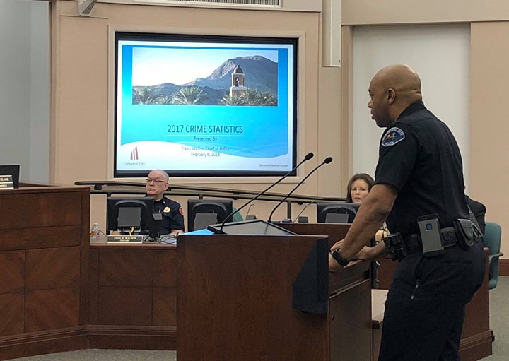 Police Chief Travis Walker announced at last night’s City Council meeting that crime against property and persons in Cathedral City had dropped 27% in 2017. This is the third year in a row that Cathedral City has seen a reduction in crime and a 54% drop in crime since 2011. Cathedral City remains one of the safest cities in the Coachella Valley.