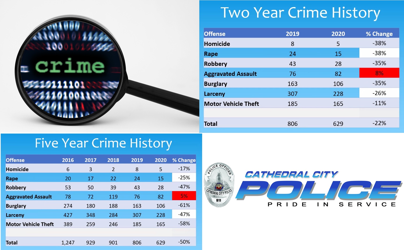 When comparing crime statistics from five years ago, Cathedral City had a 50% reduction. In 2016, the city had 1,247 total Part 1 crimes reported to the U.S. Department of Justice, and in 2020, the city reported 629 Part 1 crimes. Examples of crime reductions from 2016 include 53 total robberies in 2016 versus 28 in 2020 (47% reduction) and 274 burglaries in 2016 compared to 106 in 2020 (61% reduction).