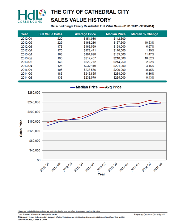 A new report, based on data from the Riverside County Recorder, shows values of Single Family Detached Homes in Cathedral City continue to rise. In fact, median home prices have increased in value nearly 65% since January 2012.