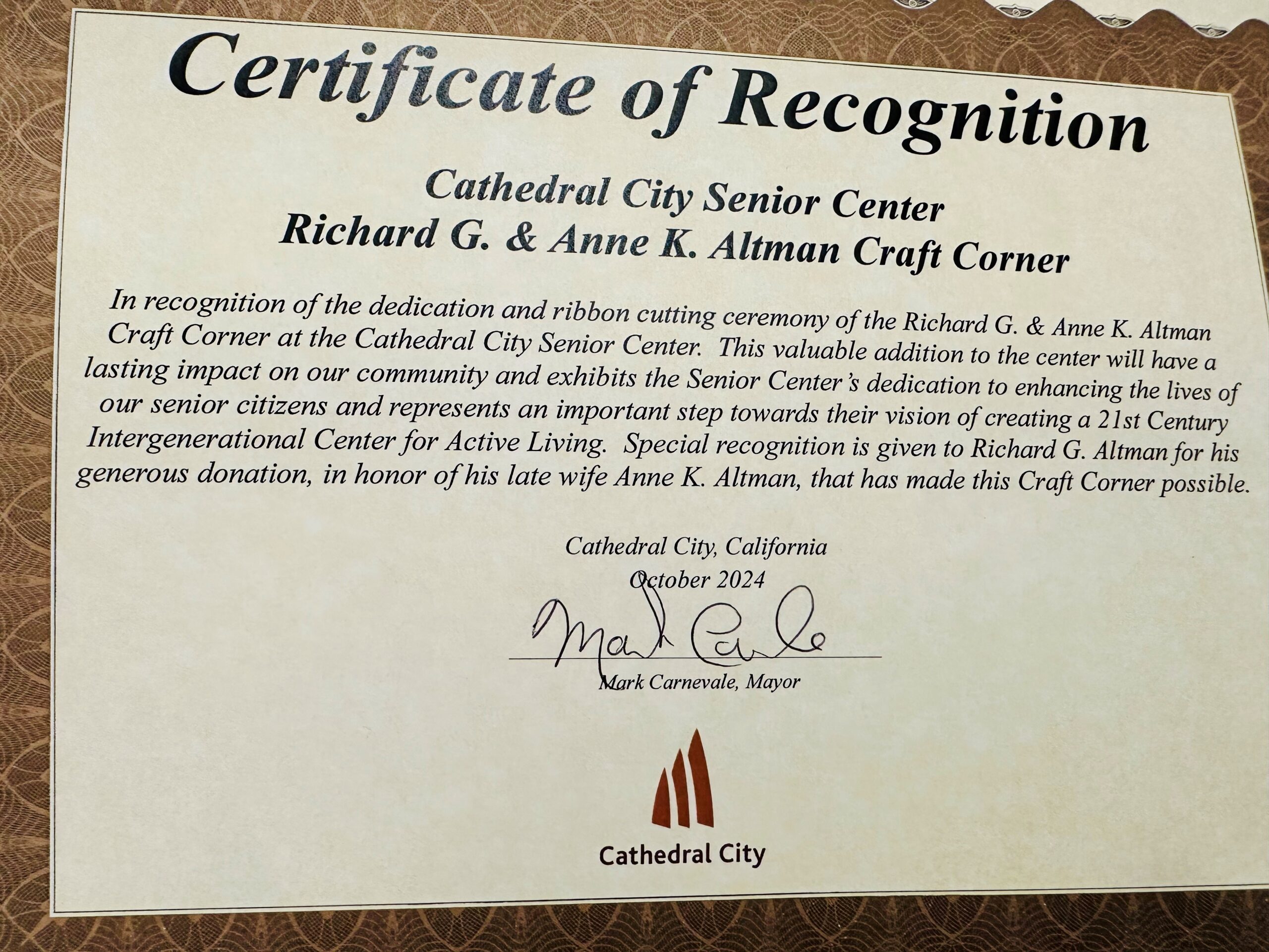 This dedicated space will serve as a creative hub where seniors can explore various artistic mediums and develop their creative talents. The addition of the Richard G. and Anne K. Altman Craft Corner also aligns with the Cathedral City Senior Center’s mission to provide engaging activities and meaningful opportunities for its members, fostering both creativity and social connection among the City’s senior population.