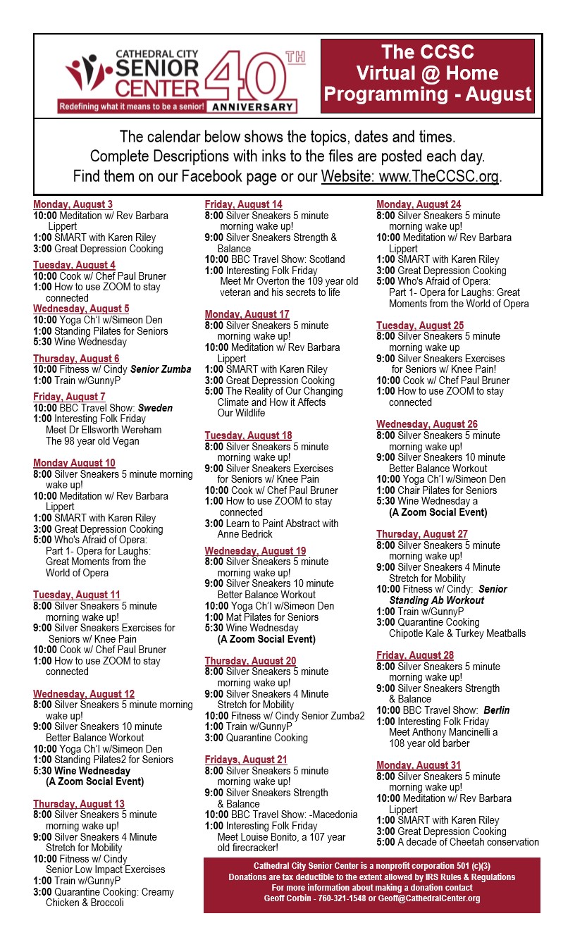 The COVID-19 pandemic continues to keep the Cathedral City Senior Center closed to the public; however, they are offering many daily programs online that you can participate in, learn, and have fun. Simply go to its Facebook page or website at www.TheCCSC.org and choose from a list of activities available online. The Center is offering videos and online classes about exercising at home, cooking, cultural and environmental programs, and the very popular, Wine Wednesdays Social Hour! Come ready to chat and have fun (don’t forget to pick up your own bottle).