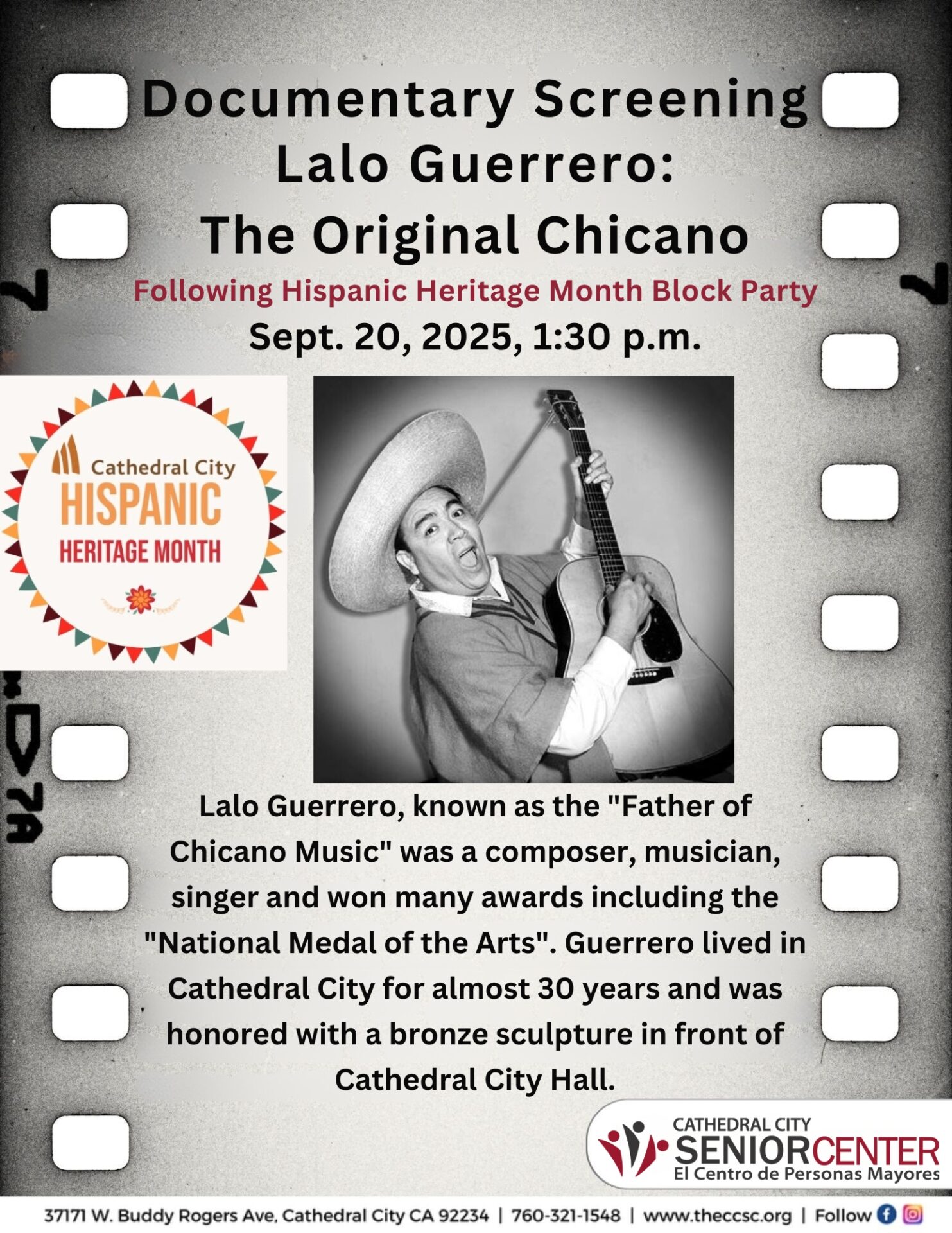 The City of Cathedral City and the Cathedral City Senior Center invite the community to celebrate Hispanic Heritage Month with a vibrant block party and special documentary screening honoring one of the city’s most beloved cultural icons. On Saturday, September 20, 2025, residents can enjoy a day filled with music, culture, and community connection celebrating the rich Hispanic and Latino heritage that defines our community.