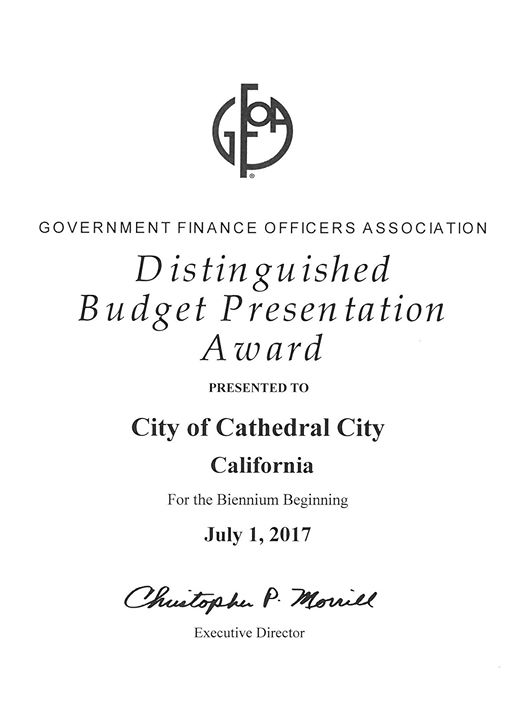 The Government Finance Officers Association of the United States and Canada (GFOA) recognized the City of Cathedral City for its biennial budget for the biennium beginning July 1, 2017 through June 30, 2019. Cathedral City received the prestigious award as the result of the governing body and staff meeting the highest principles of governmental budgeting.