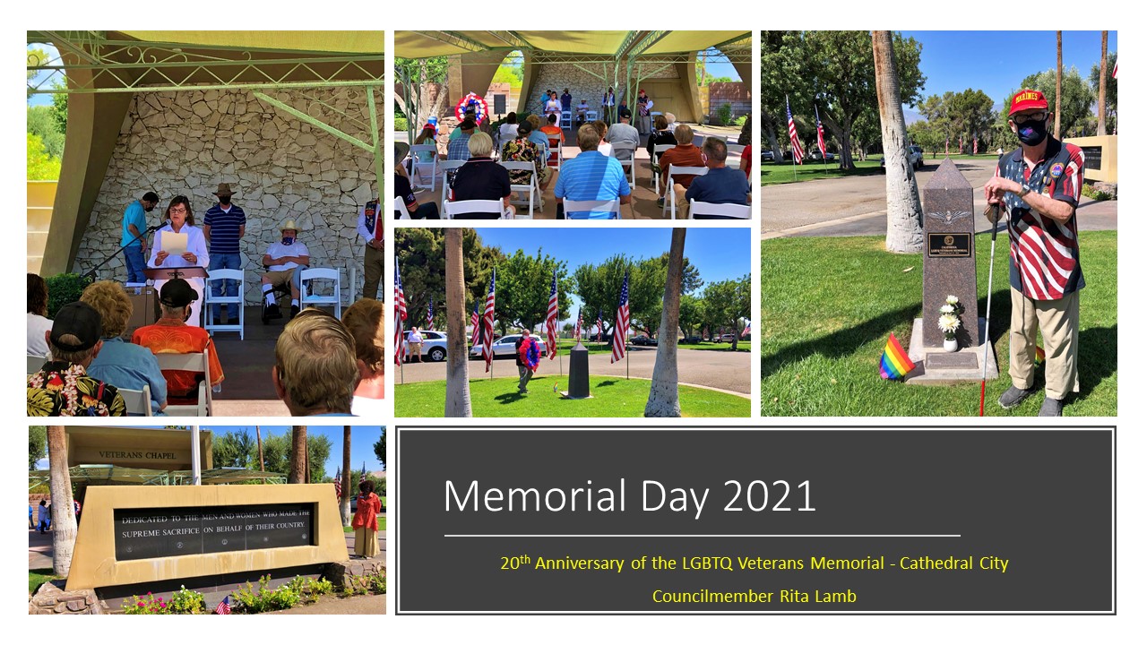 On Memorial Day, Councilmember Rita Lamb welcomed fellow dignitaries and a sizeable crowd to the Desert Memorial Park in Cathedral City to respectfully pay homage to America’s soldiers who gave the ultimate sacrifice while serving in the United States military. Hosted by AMVETS Post 66 and Veterans for Peace Representative Tom Swann Hernandez, the service included reading of federal, state and local proclamations, blessings and prayers by religious officials, and the reading of soldier names. The memorial service and Councilmember Lamb, on behalf of the city council, also paid tribute to the 20th Anniversary of the LGBTQ Veterans Memorial that recognizes the contributions of the LGBTQ community who have served in the United State military. A RAND Corporation health survey in 2016, found that 6.1% of the active personnel serving in the military identify as being part of the LGBT community.