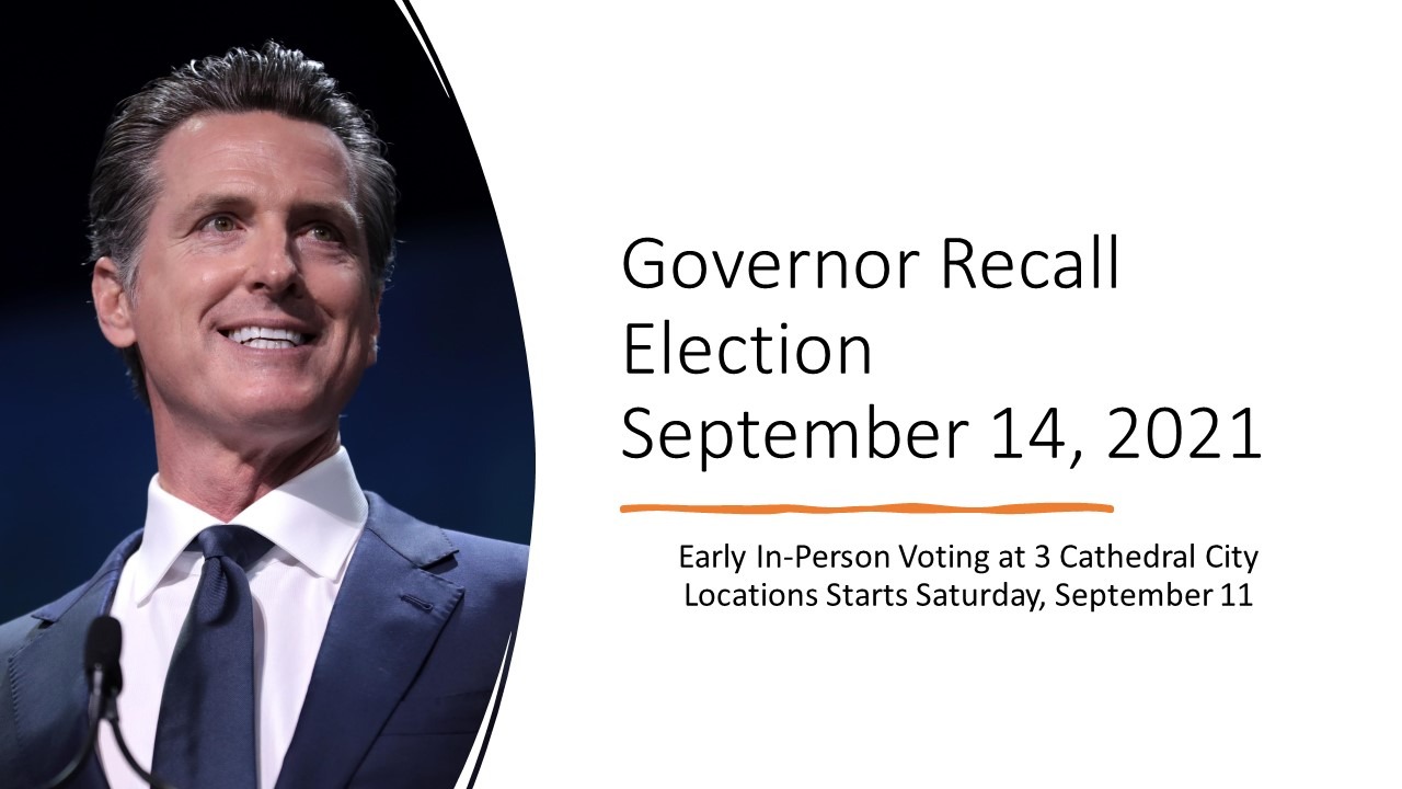 Early voting for the September 14th Special Governor Recall Election starts this Saturday, September 11 at three polling locations in Cathedral City.  These polling places will be open on September 11, 2021 through September 13, 2021 from 9:00 a.m. to 5:00 p.m. and on Election Day, September 14, 2021, from 7:00 a.m. to 8:00 p.m. Voters will be assigned to one of the locations.  The following three Polling Locations in Cathedral City are: