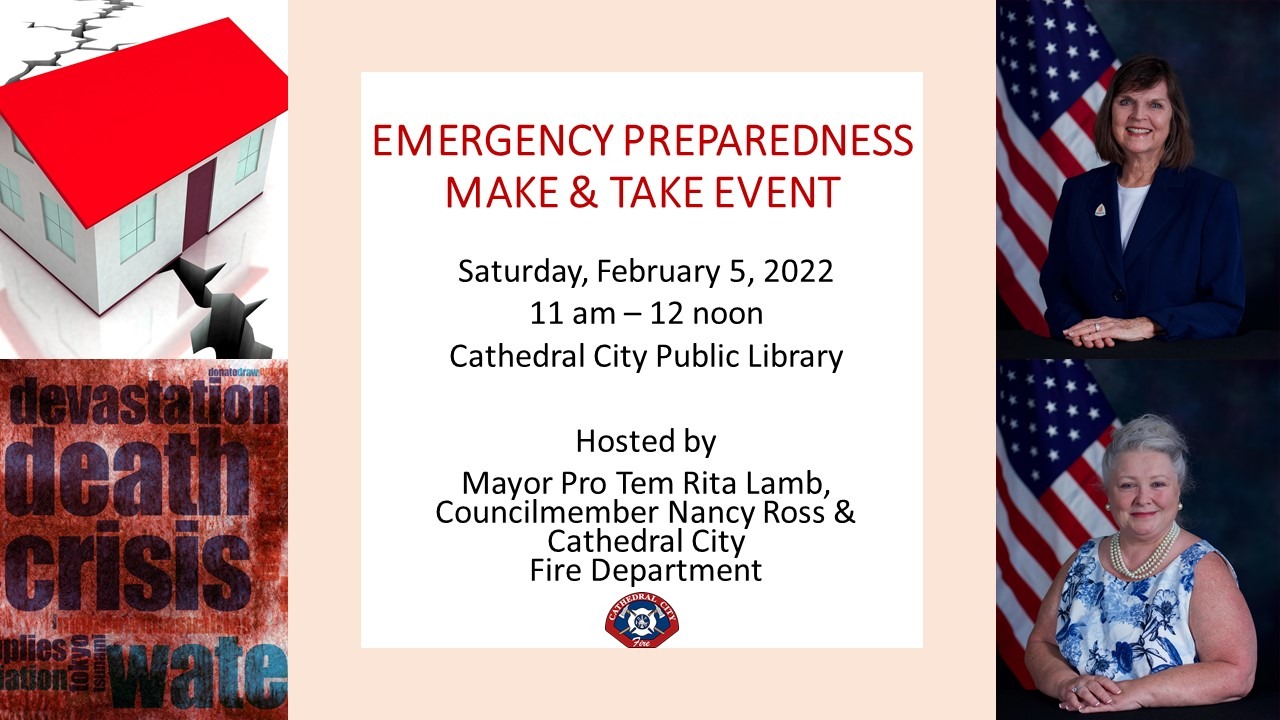 Join Mayor Pro Tem Rita Lamb and Councilmember Nancy Ross along with the Cathedral City Fire Department for a Free Emergency Preparedness – Make and Take Event scheduled for Saturday, February 5, 2022 from 11:00 am to 12:00 pm at the Cathedral City Public Library, Multi-Purpose Room, 33520 Date Palm Drive, Cathedral City. No RSVP needed, simply show up.