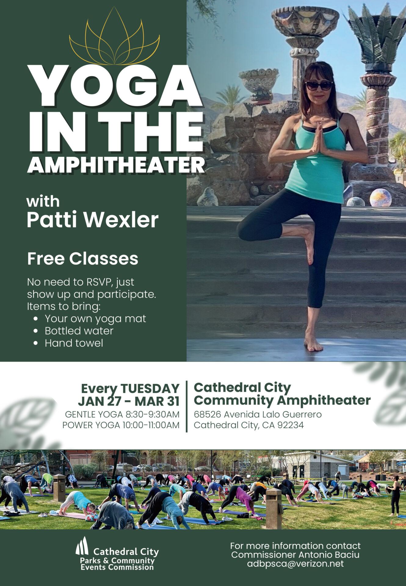 The Cathedral City Parks and Community Events Commission proudly brings free yoga classes to the Cathedral City Community Amphitheater, 68526 Avenida Lalo Guerrero, Cathedral City.