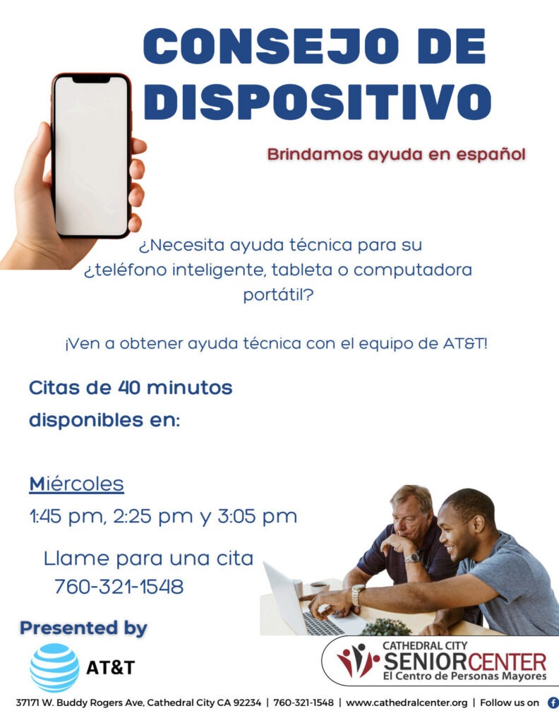 Need some tech help for your smartphone, tablet or laptop? 40-minute appointments available on Wednesdays at 1:45pm, 2:25pm, and 3:05pm. Call for an appointment 760-321-1548.
