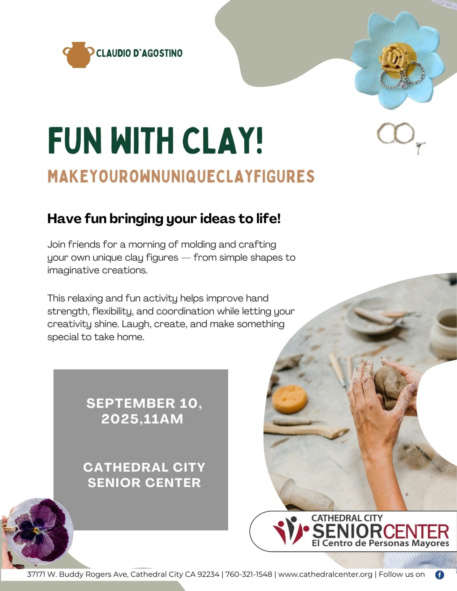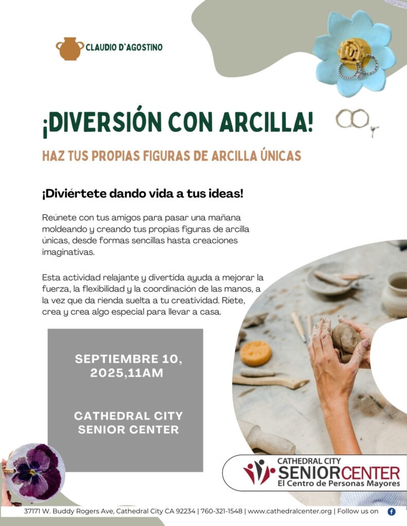 MAKE YOUR OWN UNIQUE CLAY FIGURES with Claudio D’Agostino at the Cathedral City Senior Center on September 10th at 11am.