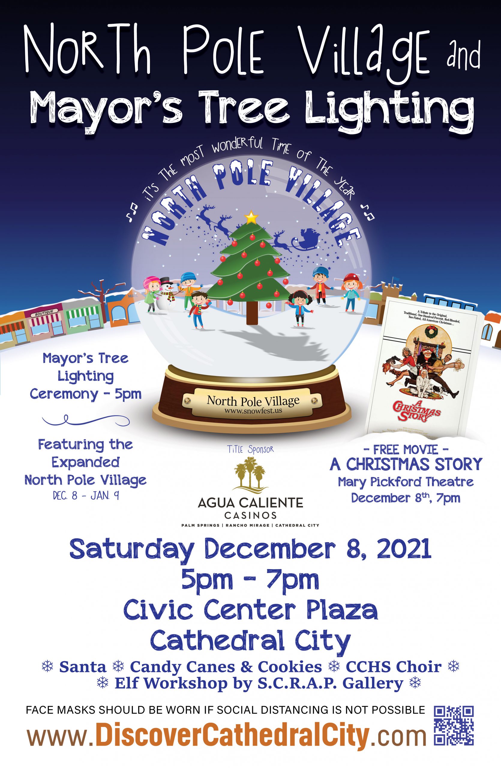 Shortly after Santa’s arrival at 5:00 pm on Wednesday, December 7, 2022, Mayor Ernesto Gutierrez will preside over the annual holiday tree lighting ceremony. The entire crowd will count down from 10 for the splendor of the season as the 30’ holiday tree in front of city hall will shine as a beacon of hope. The holiday tree will remain up and lit through the beginning of the New Year. Shortly after the Tree Lighting, the award-winning Cathedral City High School Choir will perform a limited holiday concert for your enjoyment.