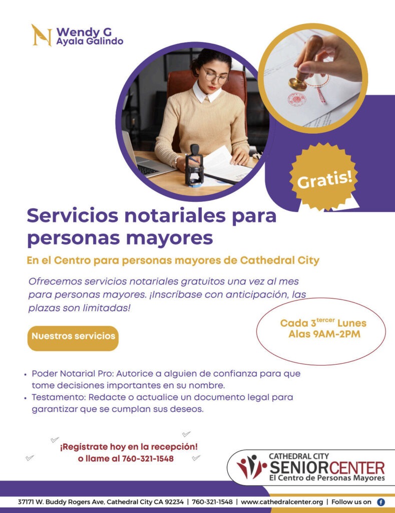 The Cathedral City Senior Center is offering free notary services once a month for seniors! Sign up in advance. Space is limited.