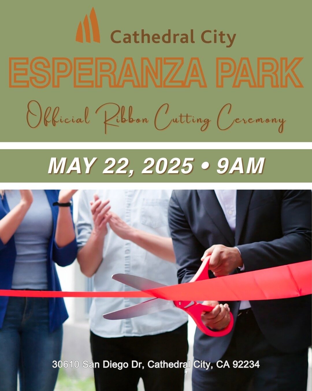 ESPERANZA PARK - OFFICIAL RIBBON CUTTING CEREMONY & GRAND OPENING Date: Thursday, May 22, 2025 Time: 9:00 AM Location: 30610 San Diego Dr, Cathedral City, CA 92234 Join Cathedral City officials and community members for […]