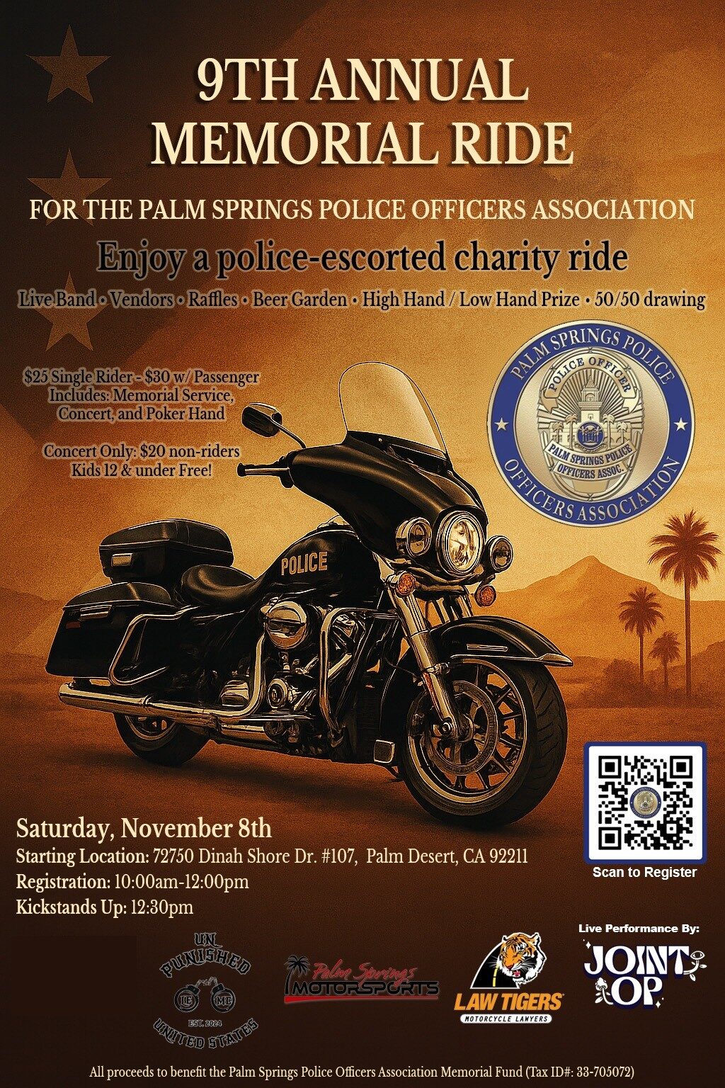 The 9th Annual Memorial Ride for the Palm Springs Police Officers Association (PSPOA) will be held on Saturday November 8th starting at 10am at Palm Springs Motorsports. The event is a police-escorted motorcycle ride from Palm […]