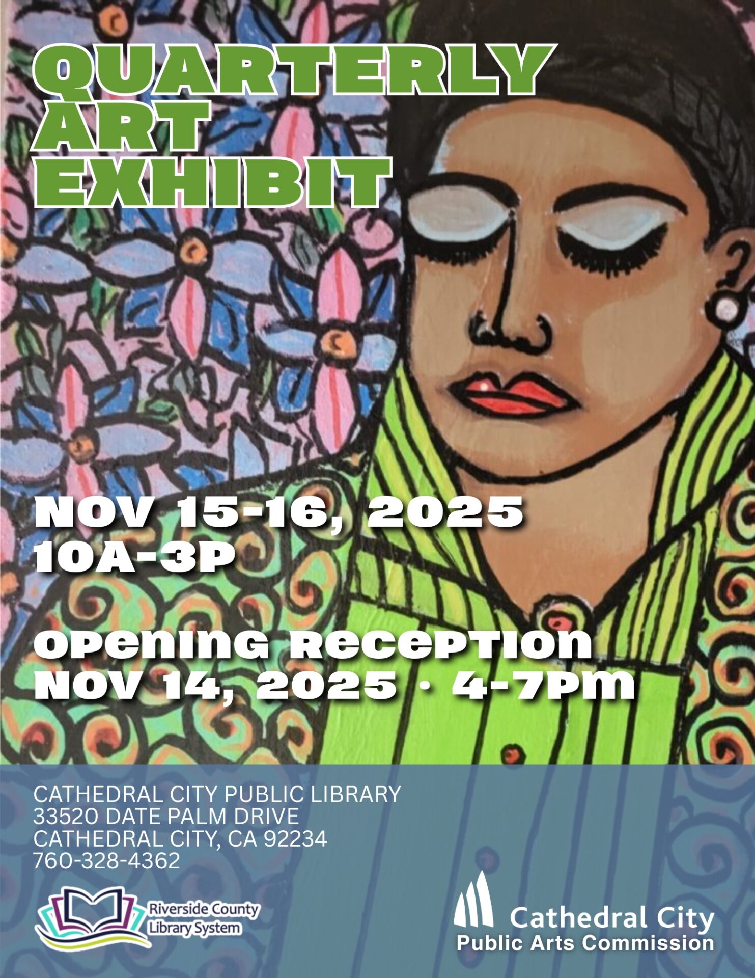 Join the Cathedral City Public Arts Commission for the Quarterly Art Exhibit on November 15-16, 2025 at the Cathedral City Library. Opening Reception on Friday, November 14th from 4-7pm.