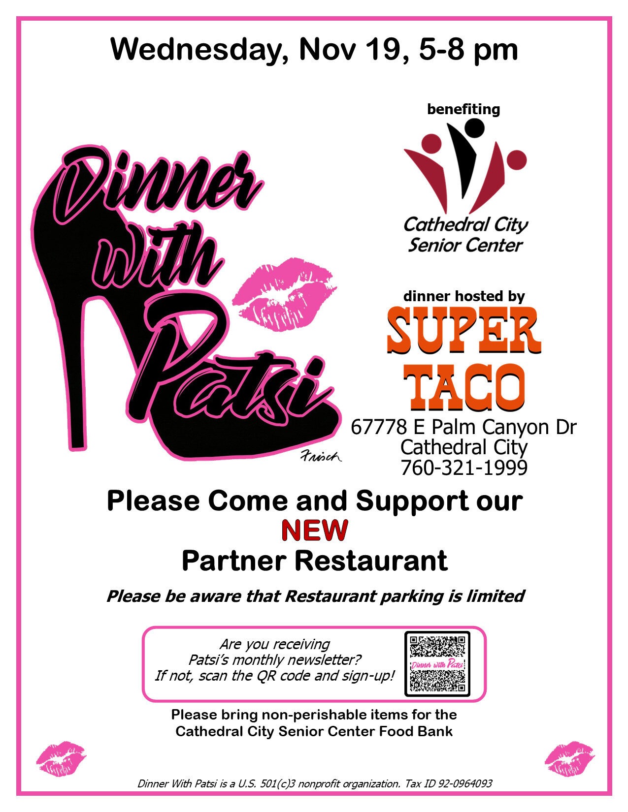 Join in the fun at Dinner with Patsi on November 19th benefiting the Cathedral City Senior Center. |