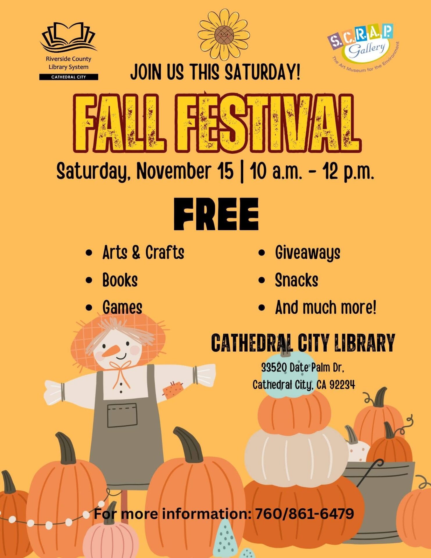 Join in the S.C.R.A.P. Gallery's Fall Festival at the Cathedral City Library - arts and crafts, books, games, give-a-ways, snacks, and more! |