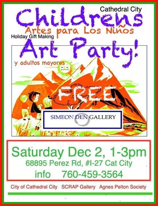 The S.C.R.A.P. Gallery and the Agnes Pelton Society hosts the Children and Elders Monthly Art Party at the Simeon Den Gallery, 68895 Perez Road, Suite I-27 (across from Frankie’s Italian Bakery) on the First Saturday of each month from 1-3 PM. Admission is free.
