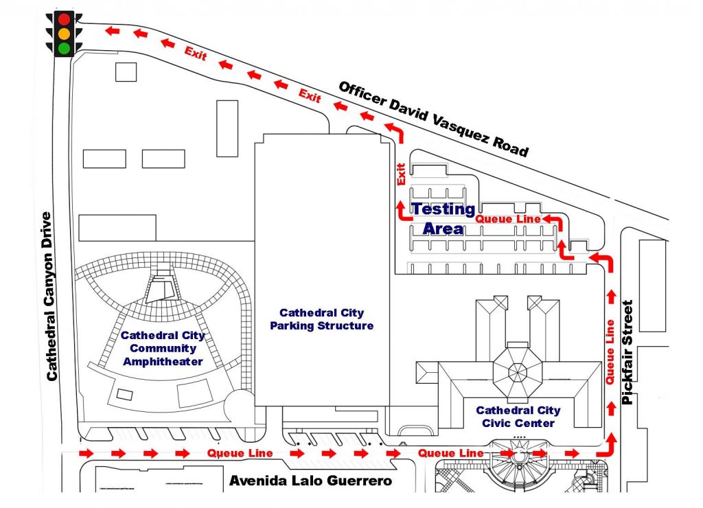 Enter queue line from Cathedral Canyon Drive onto Avenida Lalo Guerrero and follow directional signs to Testing Area