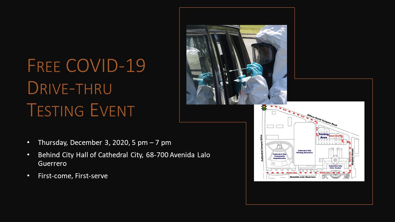 Clinica Medica Familiar – Octavio Ruiz Villalpando, M.D. will offer a free Drive-Thru COVID-19 Testing event to the public on Thursday, December 3, 2020 from 5:00 pm to 7:00 pm behind City Hall of Cathedral City, 68-700 Avenida Lalo Guerrero on a first come, first serve basis. The drive-thru testing will be limited to approximately 100 tests. You must be seated and remain in a car as walk up testing is not available. You do not need insurance for the testing, but identification is required.